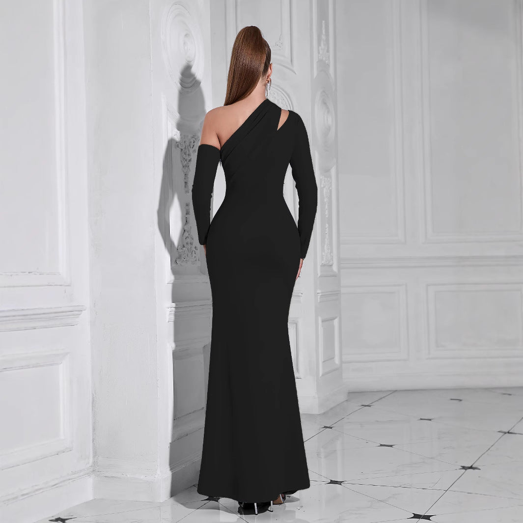 Ladies Elegant Maxi Dress with Asymmetric Neckline and Figure-Hugging Silhouette