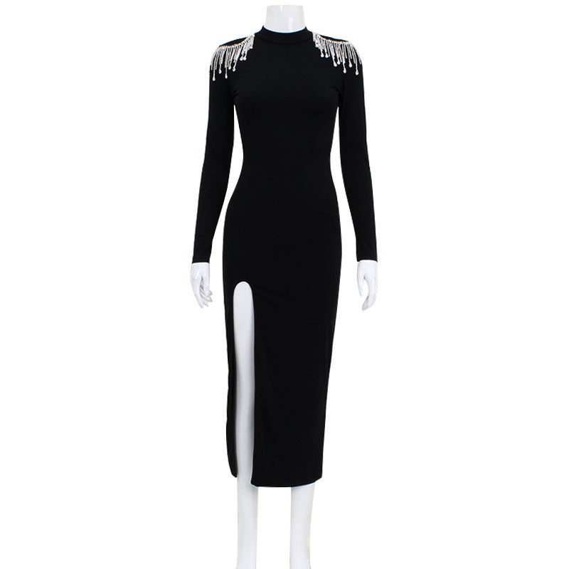 Ladies Elegant Evening Dress with High Collar and Side Split